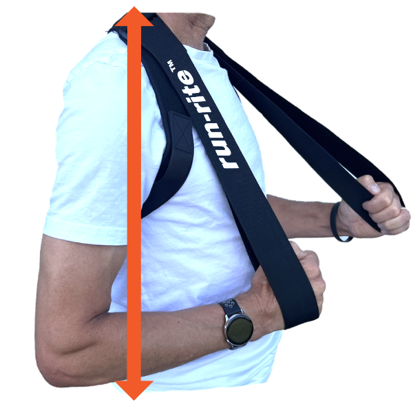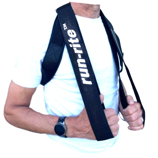 All seasoned runners know how important arm swing effects upper body balance and optimum candence (stride length) The ‘run-rite’ sling controls and your arm swing movement in precisely the right way, elbows bent at 90 degrees, hands just crossing over your breast bone.